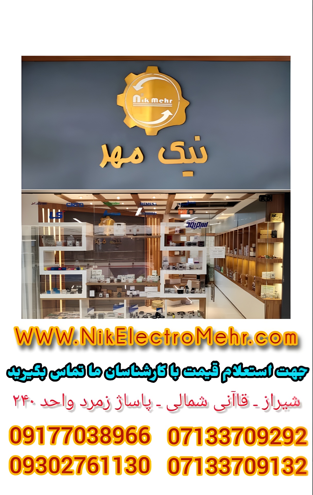 07133709132 - 07133709292کارشناس فروش : 09302761130مشاوره و پشتیبانی فنی : 09224133070info@nikelectromehr.comفروشگاه :شیراز _خیابان قاآنی شمالی _مجتمع تخصصی برق و الکترونیک زمرد _طبقه اول_واحد 240 آدرس کارگاه : شهرک صنعتی بزرگ شیراز ، میدان سوم      ویرایش